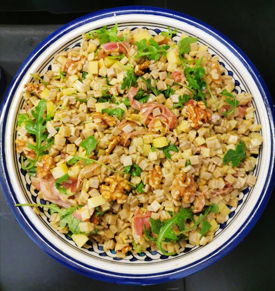Mountain salad with crozets (Beaumont cheese, Savoie cured ham, rocket and walnuts)
