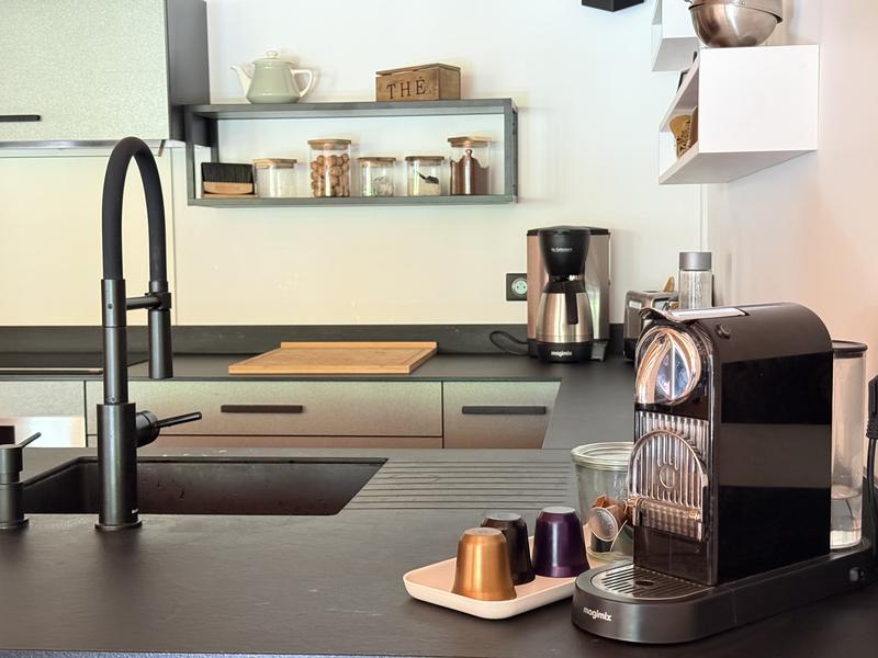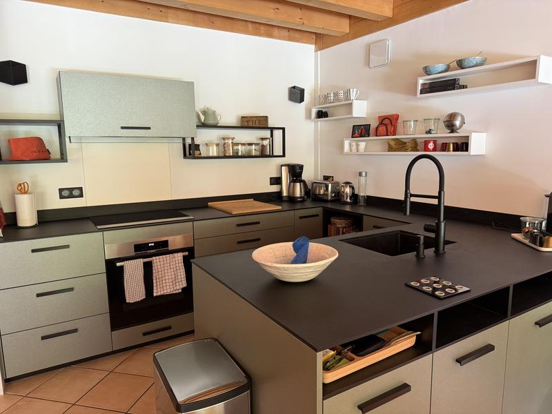 RDC : Une entrée ouvre sur un vaste séjour de 45m2. Salon équipé d'un poêle à bois, TV, wifi. Salle à manger donnant sur terrasse et jardin avec mobilier. Cuisine ouverte tout équipée avec arrière cuisine.