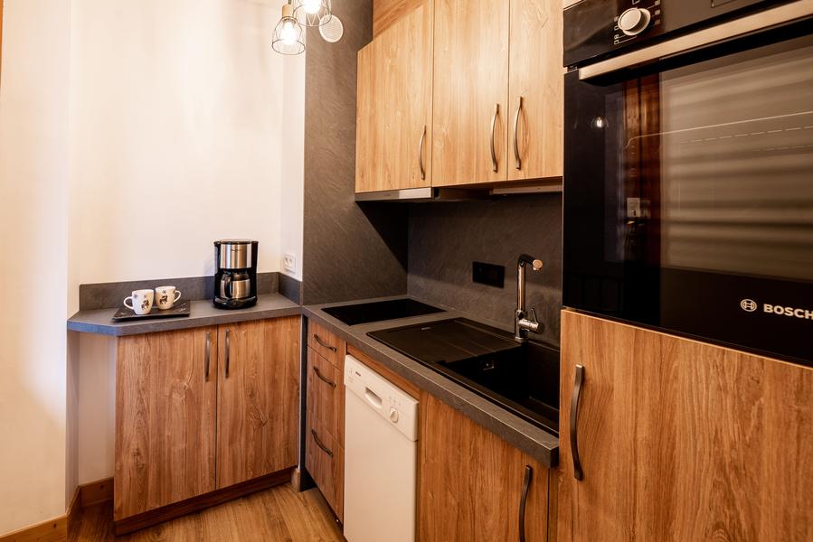 Gesloten keuken met koelkast, keramische kookplaat, oven en magnetron, afwasmachine.