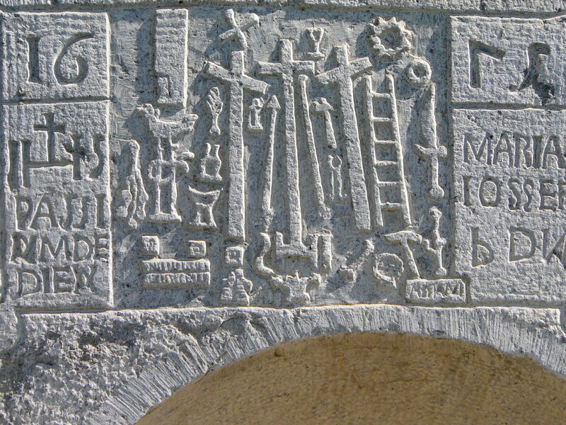 Volgens de traditie werd de klok van de kapel van Vigny tijdens de Revolutie begraven. Omdat de plek van de schuilplaats niet werd gevonden, moest het gebouw helaas worden voorzien van een nieuwe klok. Op de gevel van het gebouw staat een doopvont en een beeldhouwwerk dat de instrumenten van de Passie voorstelt. Rechts, boven de doopvont, in afgeplatte vorm gebeeldhouwd door een Dunoyer, staan de instrumenten van het Lijden van Christus. De klokkentoren is bedekt met leien.
